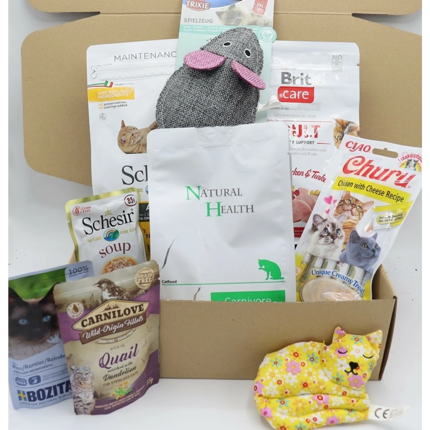 De box bevat: Churu, Schesir soup, Bozita rendier, Carnilove Quail, Schesir kip 400 gram, Natural Health Carnivore 400 gram, Brit Chicken&Turkey 400 gram, een reuze muis* en een Kat met Valeriaan*.