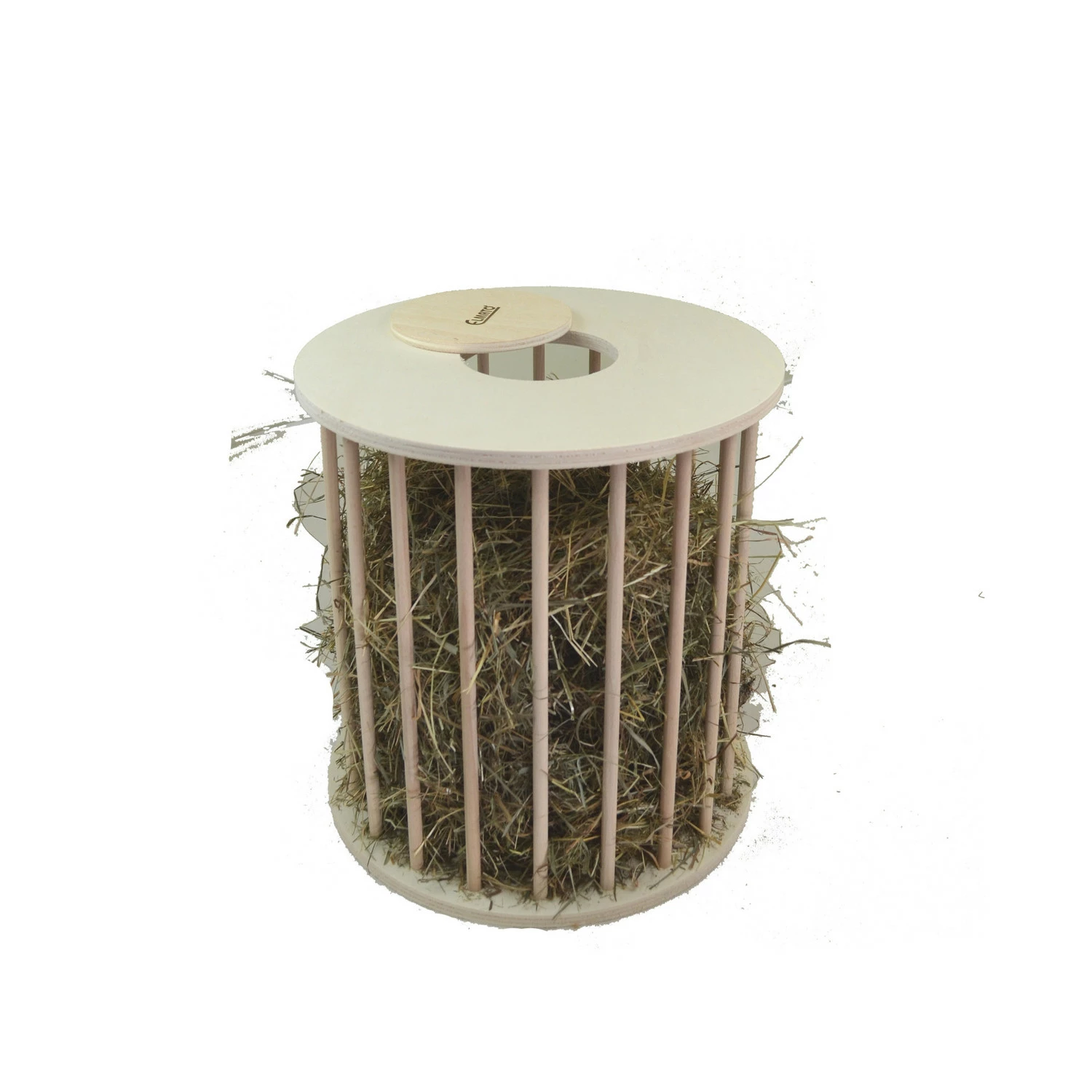 Deze grote hooitrommel is handig bij het voeren van hooi aan konijnen en cavia’s. De hooiruif is groot, waardoor er een flinke hoeveelheid hooi in past. De hooiruif is gemaakt van natuurlijk hout. De afstand tussen de spijlen is ongeveer 4 cm. De hooitrommel wordt geleverd exclusief hooi. De spijlen zijn gemaakt van beukenhout.