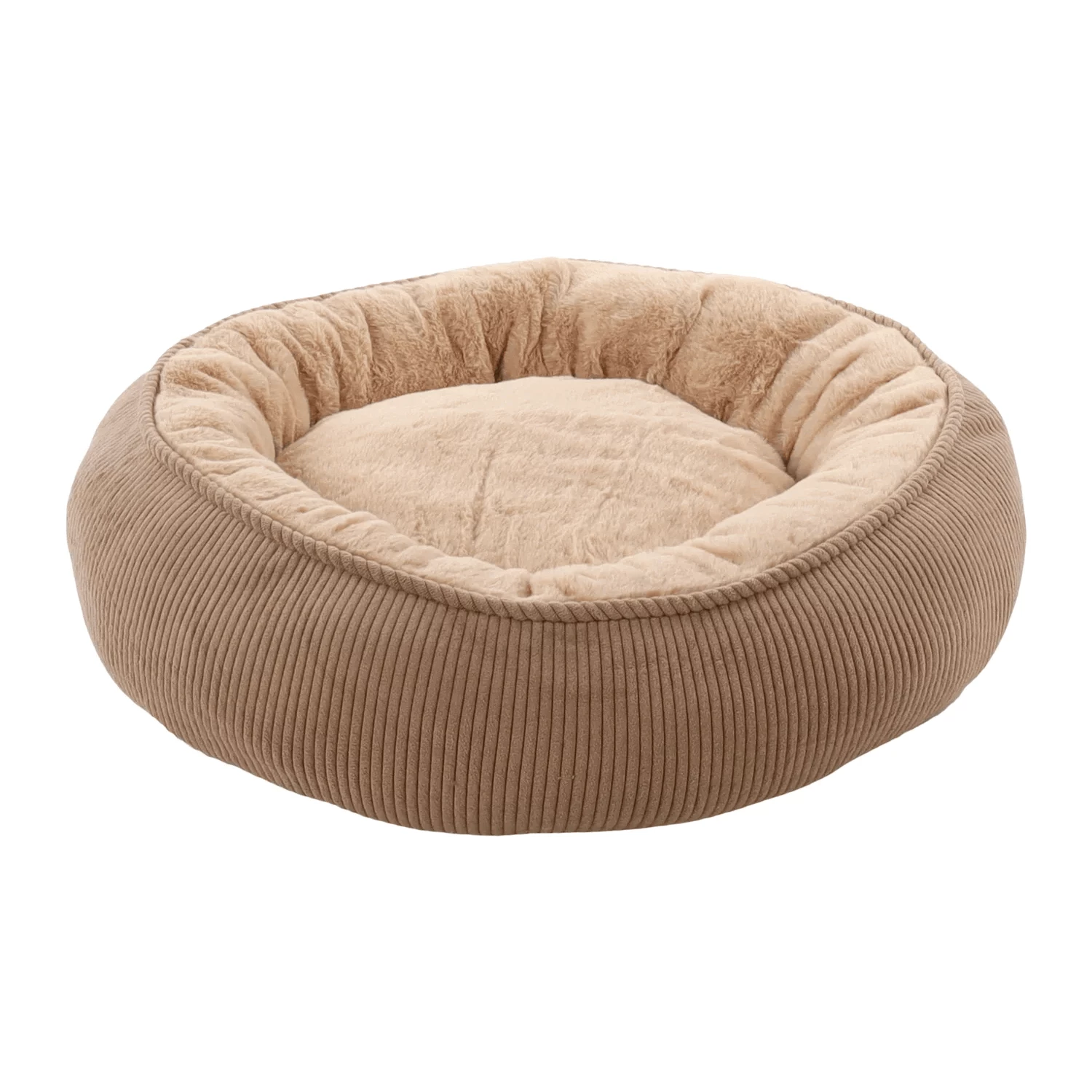 De Flamingo Mand Rond Colette is een mand voor katten en kleine honden. De buitenkant is voorzien van stevig, maar zacht ribfluweel. De binnenkant is gemaakt van zacht pluche. De rand is goed gevuld zodat jouw huisdier het hoofd op kan rusten. Het kussen is aan de ene kant voorzien van ribfluweel en de andere kant van het zachte pluche in dezelfde kleur. Je kan zelf kiezen welke stof je boven hebt liggen, want het kussen zit los van de mand. De hoes van het kussen kan eenvoudig er vanaf gehaald worden door middel van een rits. De onderkant is voorzien van antislip zodat de mand stevig op zijn plek blijft liggen.