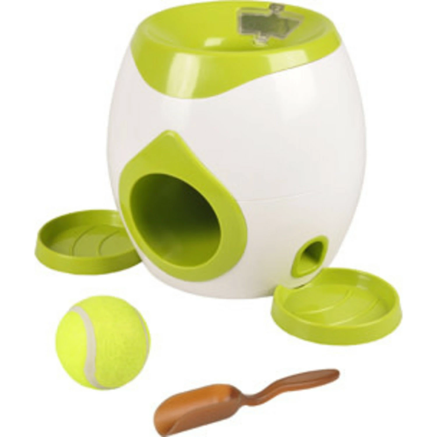 Dit interactieve hondenspeelgoed Wilson laat de hond apporteren zonder dat jij er iets voor hoeft te doen. De hond wordt na het terugbrengen van de bal beloond met een lekkere snack of droogvoer. Het speelgoed wordt geleverd inclusief een bal en schepje en is direct uit voorraad leverbaar.