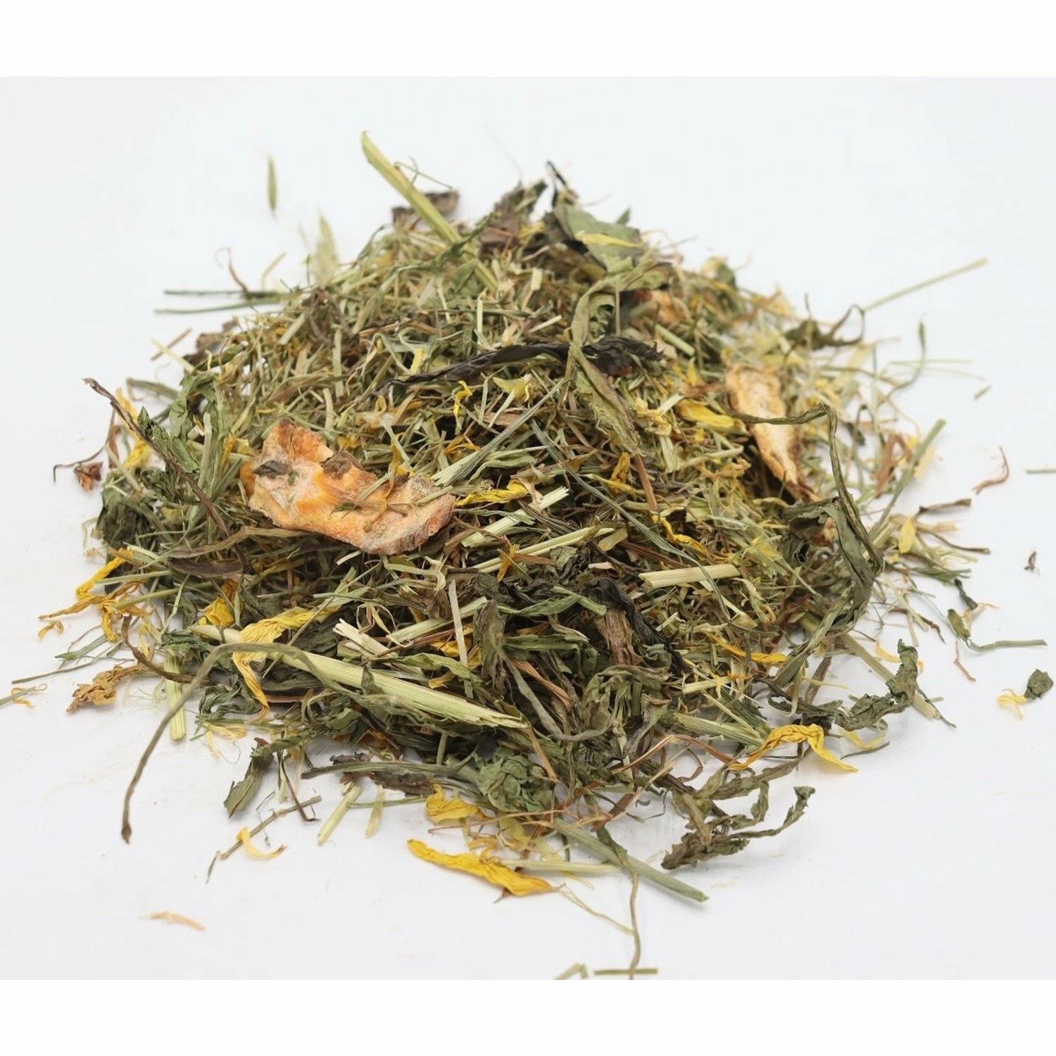 Samenstelling:Â Weidegrasmengsel*, peterseliesteeltjes, wortel, groene haver, brandnetelblad, goudsbloembloemen, rode klaver bloemen, zonnebloembloemblaadjes, smalle weegbree, paardenbloembladeren, brede weegbree, kamille.