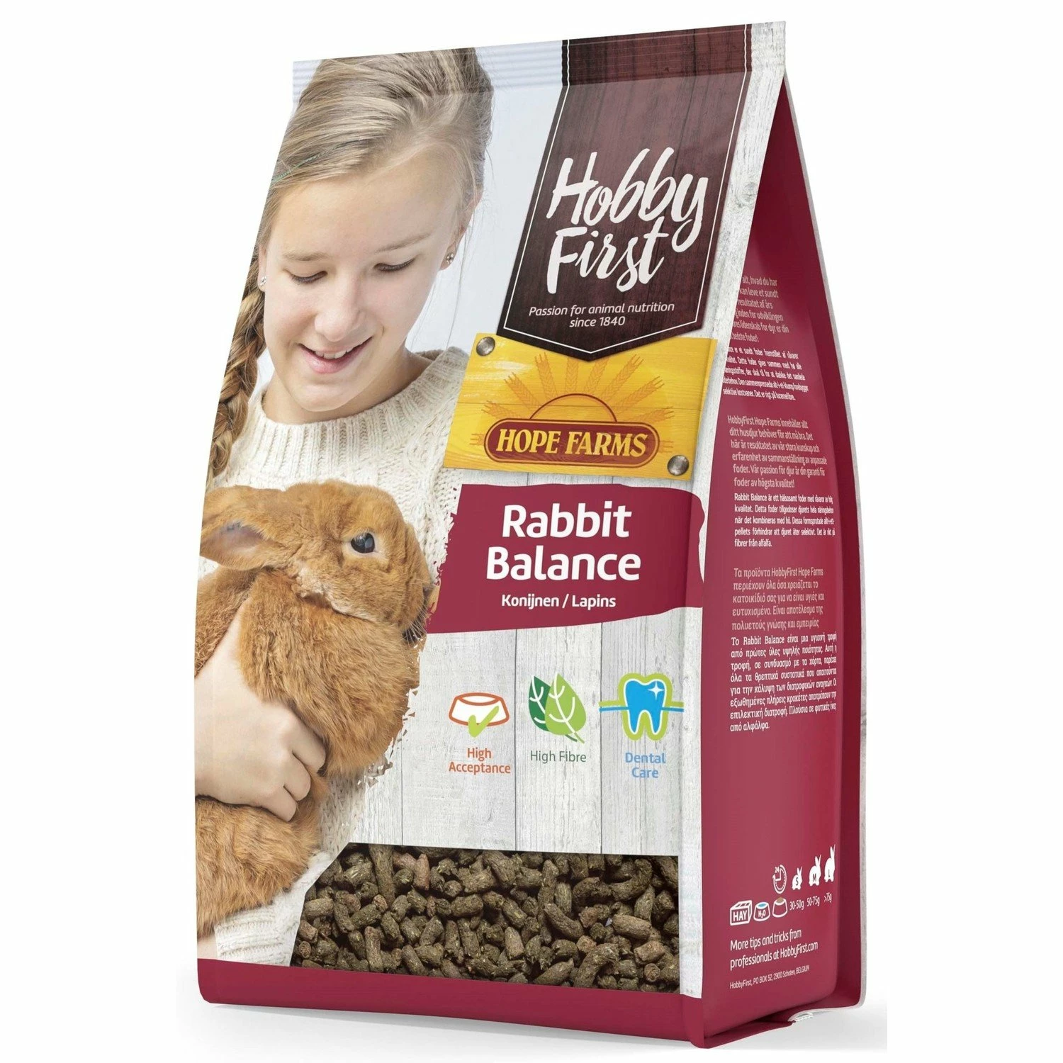 Hope Farms Rabbit Balance is een gezond, uitgebalanceerd menu van geëxtrudeerde premiumvoeding met waardevolle natuurlijke grondstoffen en smakelijke ingrediënten zoals luzerne, granen en zaden. Aan Rabbit Balance zijn geen synthetische kleur-, geur- en/of smaakstoffen toegevoegd. Het bevat alle benodigde vitaminen en mineralen om uw konijn in goede conditie te brengen en te houden. Door de toevoeging van Yucca wordt de onaangename geur van urine en ontlasting sterk verminderd. Daarnaast is Rabbit Balance verrijkt met Ginseng vanwege de bewezen positieve uitwerking op de vitaliteit en het welzijn. De grondstoffen zijn met zorg geselecteerd en de premiumvoeding bevat met name die ingrediënten, die konijnen ook in de natuur zouden vinden en waar ze bovendien dol op zijn. Ieder brokje is exact gelijk van samenstelling, zodat de dieren niet alleen hun meest favoriete smaakje eruit kunnen halen. Zo wordt voorkomen dat er tekorten ontstaan.