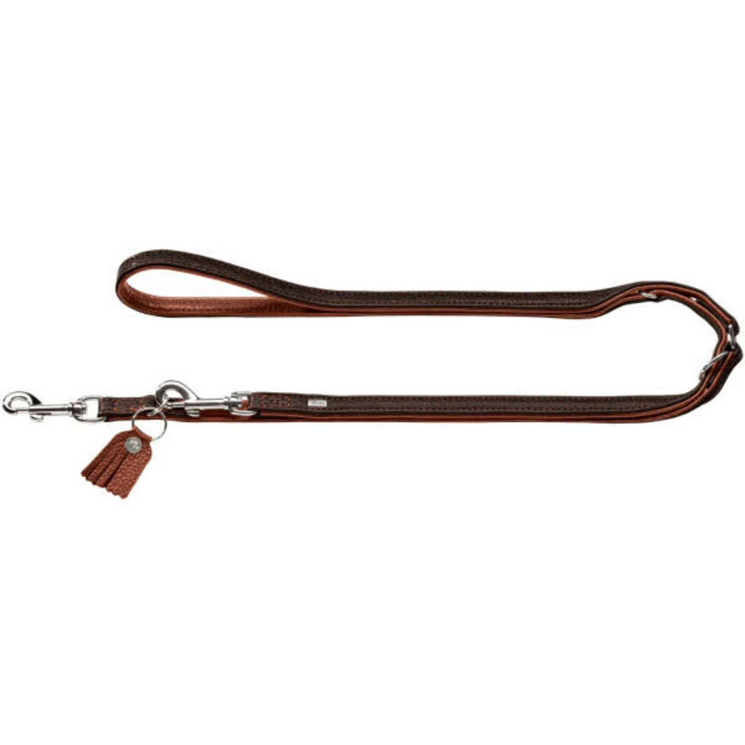 Deze donkerbruine hondenriem is gemaakt van rundleer. Dankzij een royale toevoeging van olie en een natuurlijk verfproces, is de riem ook bestand tegen zware belasting. Â Hierdoor is de looplijn uitermate geschikt voor hondensporten. Daarnaast is het leer ook soepel en zacht waardoor het fijn in de hand ligt. Bij geverfd leer kan er een lichte verkleuring optreden.