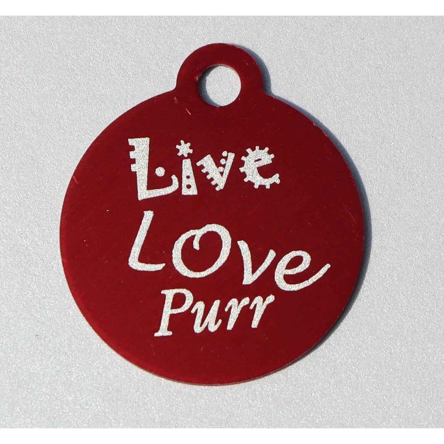 Kleur: Rode achtergrond met witte tekst: Live Love Purr erop