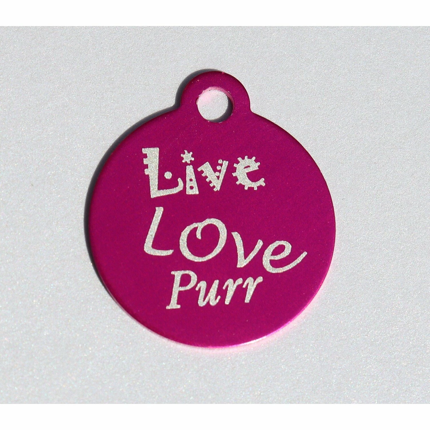 Kleur: Roze achtergrond met witte tekst: Live Love Purr erop