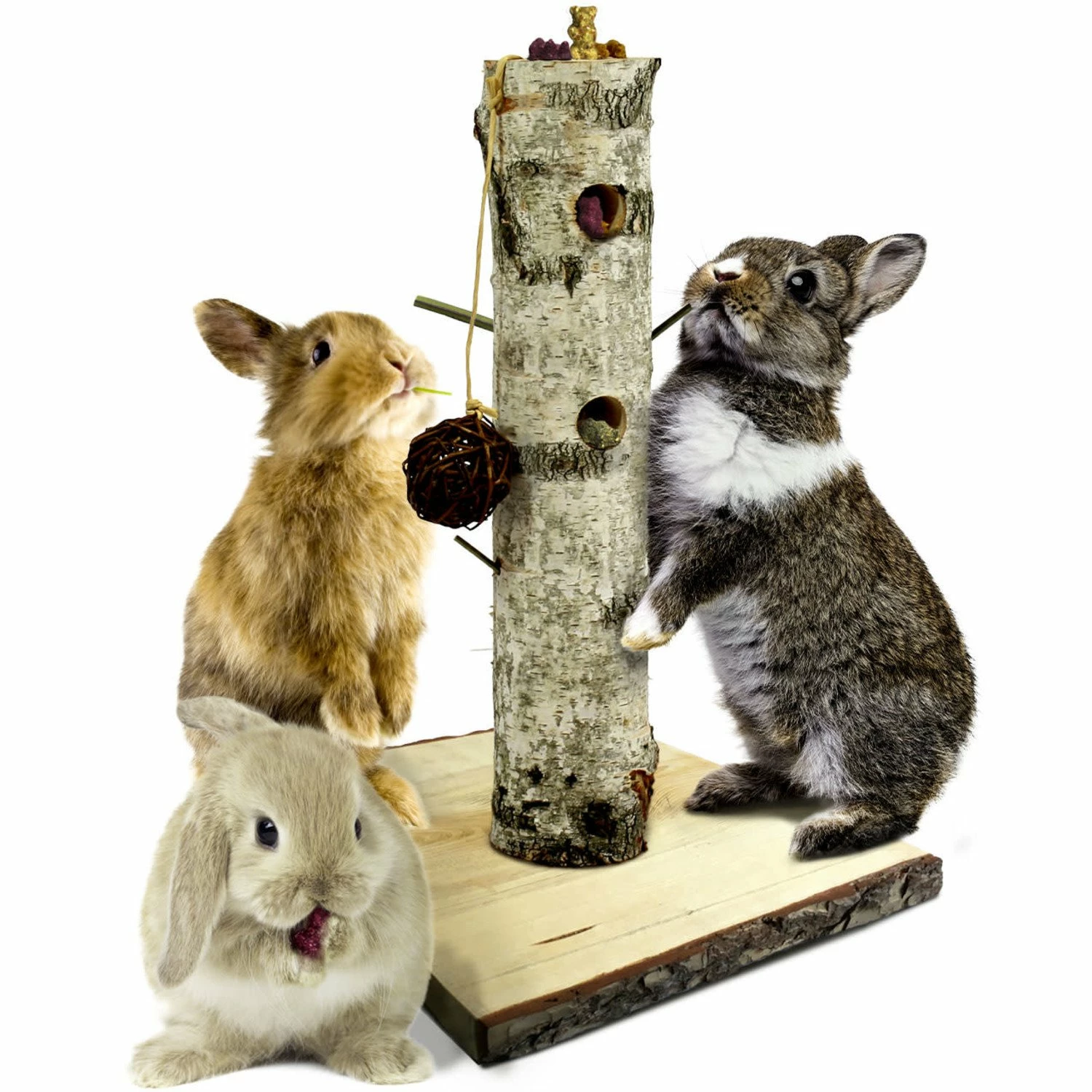 Je kunt deze boom vullen met groente, takken, hooi en kruiden. Je zorgt zo voor een diervriendelijke bezigheid en een mentale uitdaging.