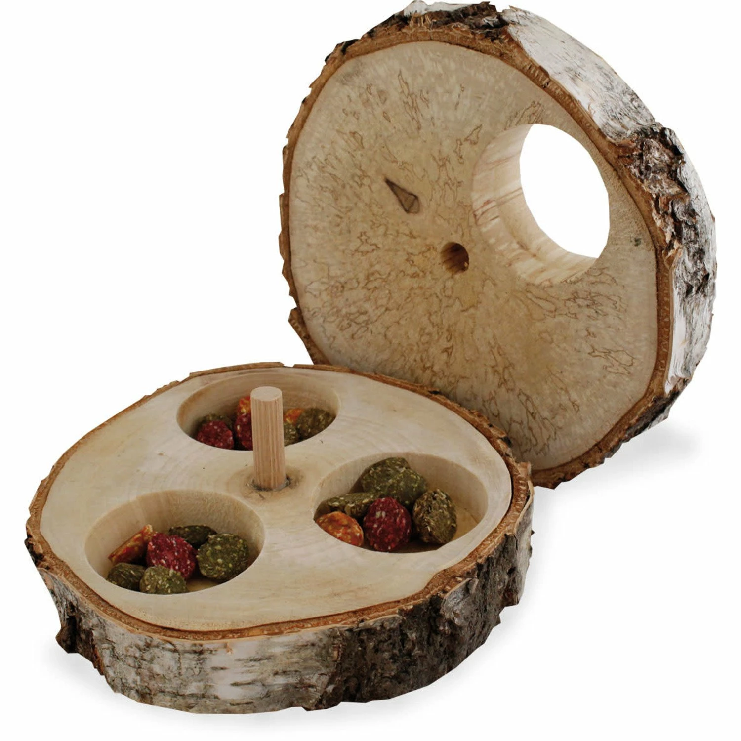 De bovenste schijf kan rond gedraaid worden om bij de uitsparingen met snacks/voer/beloning uit te komen.