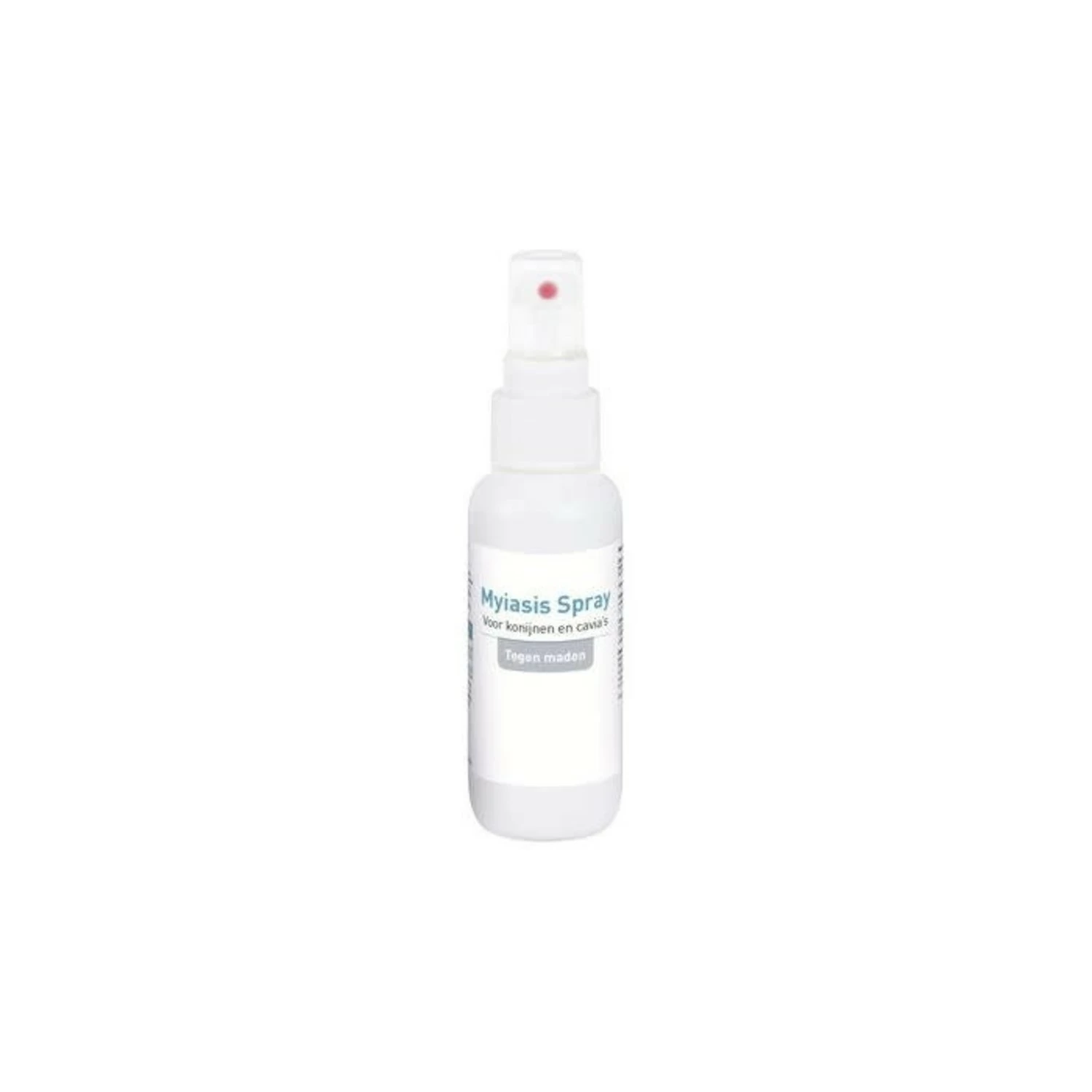 Anti-Myiasis spray is voor de bestrijding van vliegenlarven- en eitjes bij hobbypluimvee, postduiven, kleine knaagdieren en konijnen die niet bedrijfsmatig worden gehouden. Nomyiasis Anti-Myiasis spray bestrijdt infecties met vliegenlarven (maden) en vliegen-eitjes van Lucilia Sericata en verwante vliegensoorten bij konijnen die niet bedrijfsmatig worden gehouden, hobbypluimvee, postduiven en kleine knaagdieren. Myiasis vliegen worden vooral aangetrokken door met ontlasting en urine vervuilde vacht. De vliegeneitjes worden gelegd in de aangekoekte vacht. Voor een goed resultaat van de behandeling moet de vacht daarom eerst worden schoon gemaakt. Aangekoekte ontlasting, losse haren en klitten dienen te worden verwijderd, ze verminderen namelijk de werking en verhogen het risico op Myiasis. In geval van een infectie met maden is het raadzaam om direct een dierenarts te raadplegen. Het bestrijden van de maden en schoon maken van de wond is slechts onderdeel van een therapie. Dit type infecties is levensbedreigend. Vaak ontstaat er een secundaire bacteriële infectie en een daarmee gepaard gaande sepsis (bloedvergiftiging). Als jouw dier regelmatig aangekoekte ontlasting heeft raadpleeg dan jouw dierenarts.