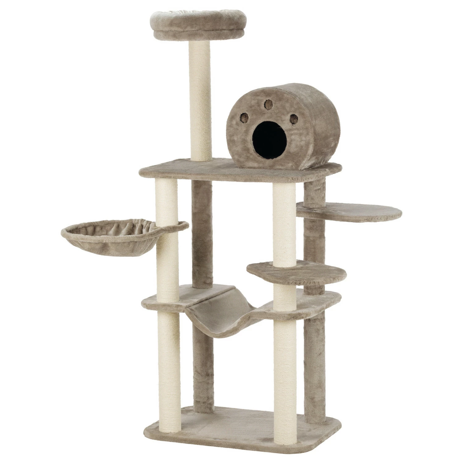 Krabpaal Fabiola is zowel breed als hoog en geeft uitdagingen op het gebied van klimmen, klauteren, luieren en spelen. Het hoogste plateau zit op 165 cm waardoor de kat vanuit daar de hele omgeving in de gaten kan houden. Een verdieping lager zit een breder plateau met een schuilhuis waar heerlijk in geluierd kan worden. Daarnaast heeft Fabiola een hangmand en nog 3 plateaus waar langs geklommen kan worden of op gezeten kan worden om de boel in de gaten te houden.