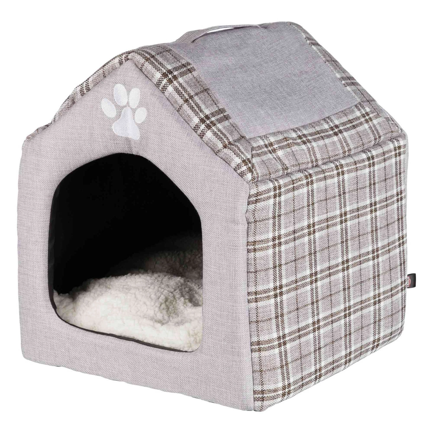 Dit huis is niet alleen comfortabel, maar ook heel erg leuk! Deze leuke hondenmand heeft de vorm van een echt huisje, met een dak en al. Het mandje is gemaakt van geweven stof en polyester bekleding. Door de schuimrubber vulling is het huisje stevig en vormvast. Het ruitjespatroon en de leuke grijze voorkant geven de mand een leuk, tijdloos uiterlijk. In de mand ligt een lekker kussen van polyestervlies met bekleding van schapenvacht-look in crèmekleur.