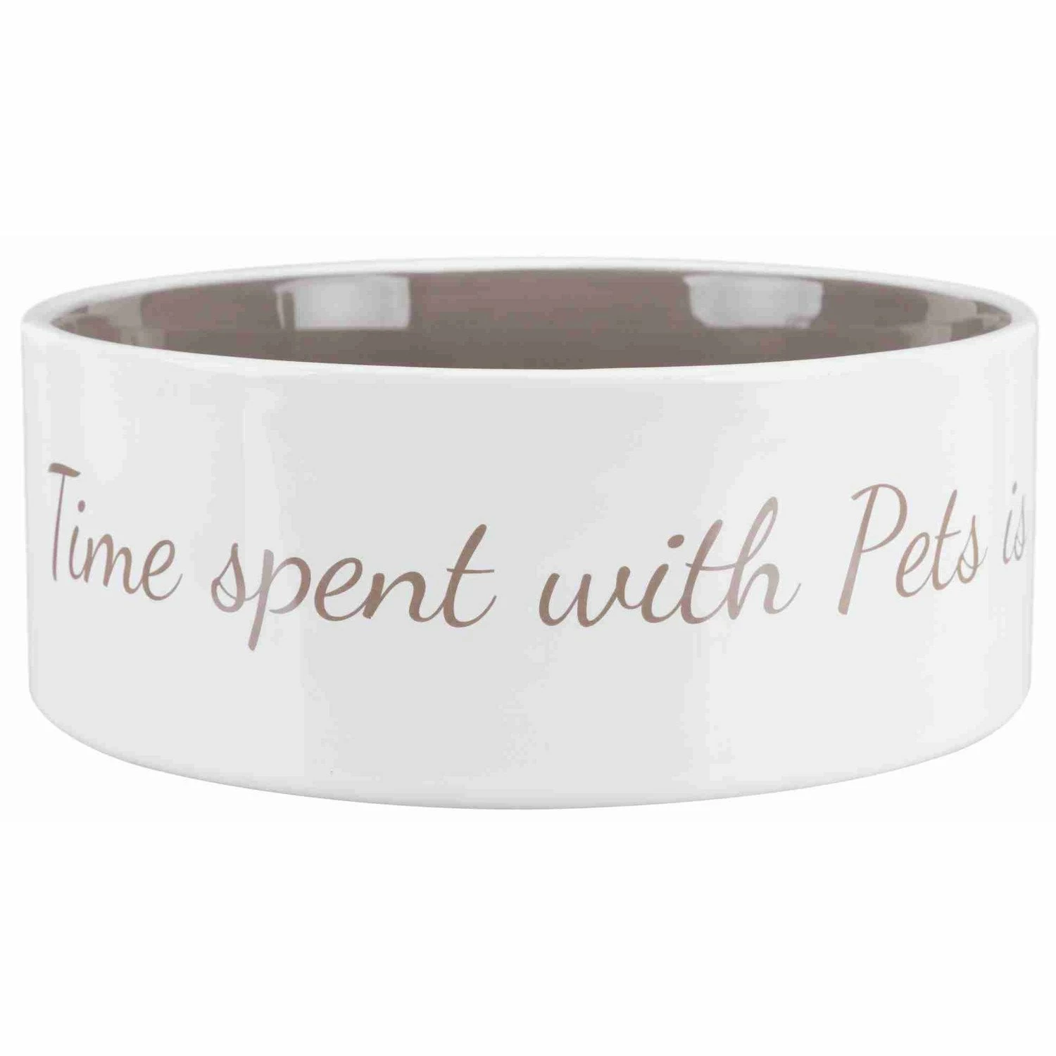 Deze stenen bak heeft een taupe binnenkant met een hart van pootafdrukken op de bodem. De zijkant is wit met de taupe kleurige tekst: “Time spent with Pets is never waste”.
